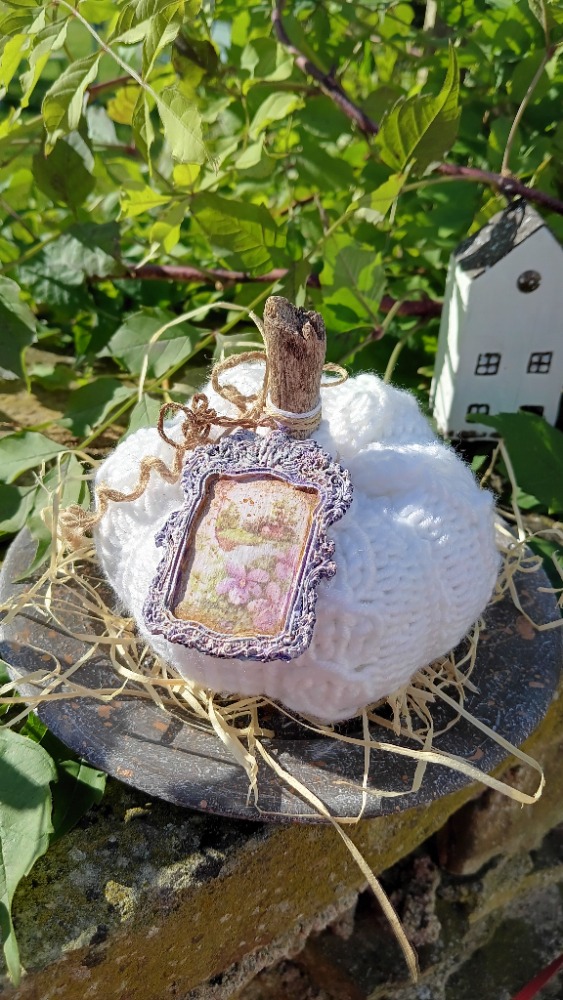 Ručně pletená dýně bílé barvy s dřevěnou stopkou a ručně vyrobenou fialovou visačkou s podzimními motivy a nápisem podzim. Dýně je zdobená krouceným provázkem.
