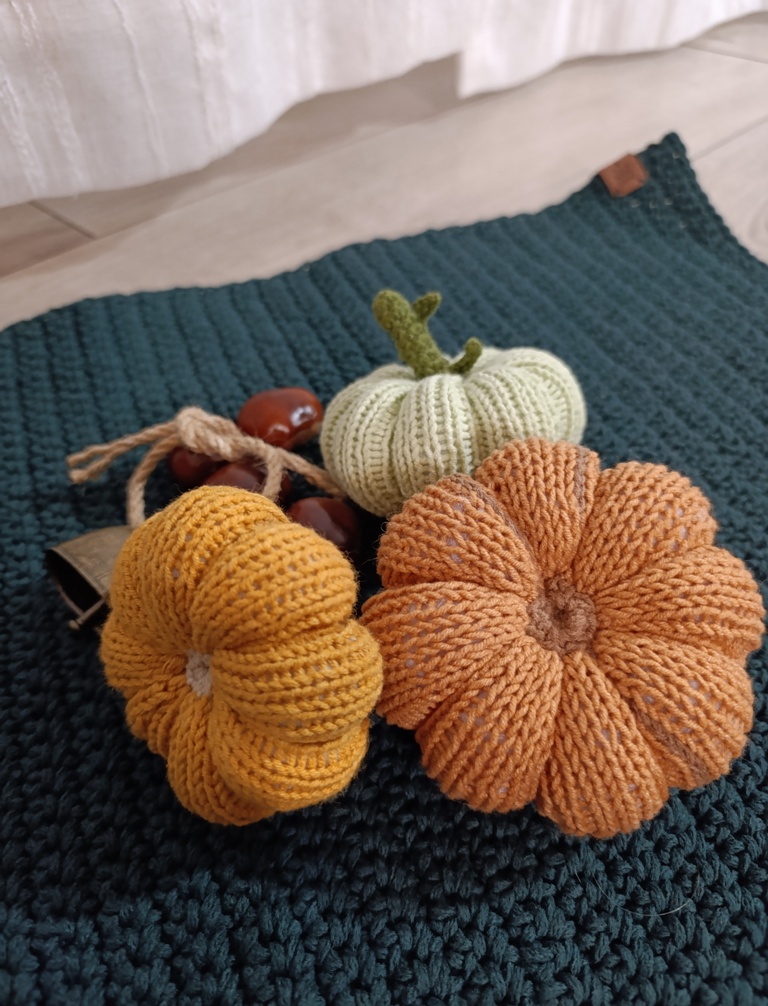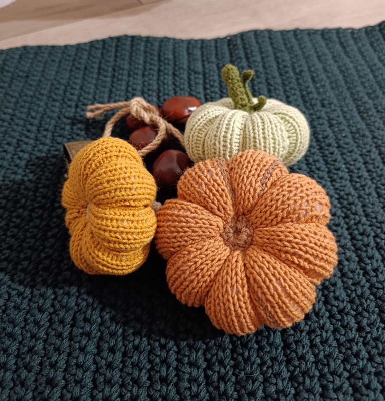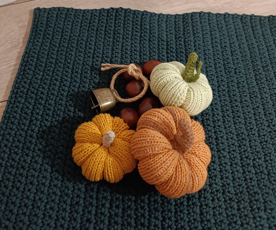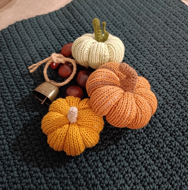 Dýně jsou pletené z bavlněné příze, stopky jsou háčkované a dýně jsou vyplněné dutým vláknem.