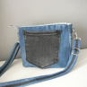 Malá kabelka ušitá z recyklované riflové látky. Vhodná pro každodenní nošení i pro výlety na dovolenou. Uvnitř jsou tři kapsy, aplikace hvězdy z pravé kůže. Posuvný popruh. Zapínání na zip.