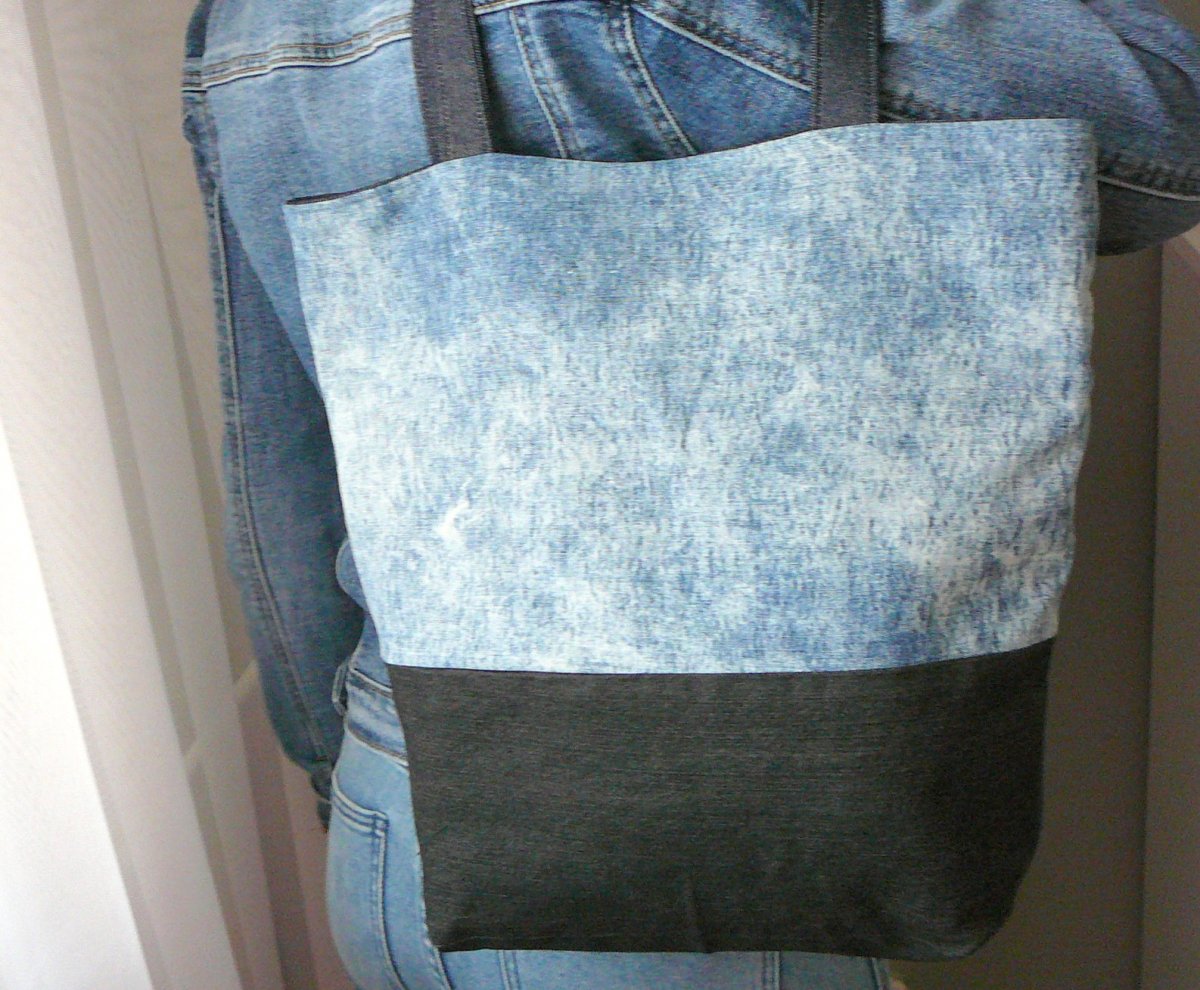 Kabelka ušitá z džínové recyklované látky, doplněná elementy z reci džínoviny. Vepředu jsou 2 kapsy zachované od původních riflí. Zapínání na magnet.