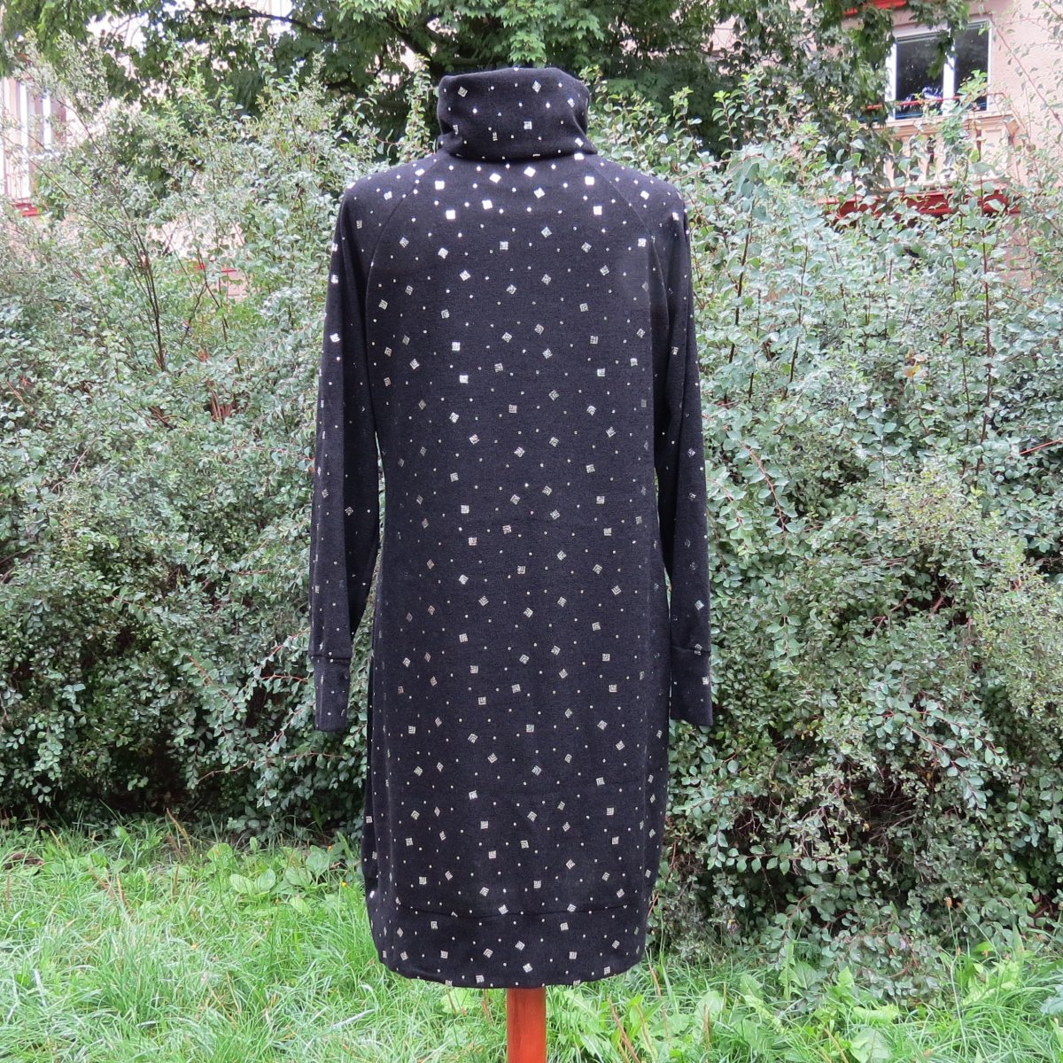 Rozměry: horní obvod = 104 cm, boky = 106 cm, délka rukávu od krku včetně manžety 72 cm, délka šatů včetně manžety dole 94 cm. Dobře padnou ženám, které nosí konfekční velikost 42.