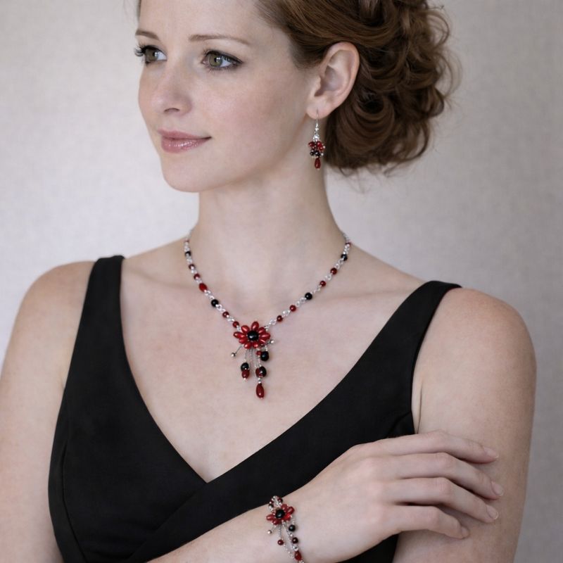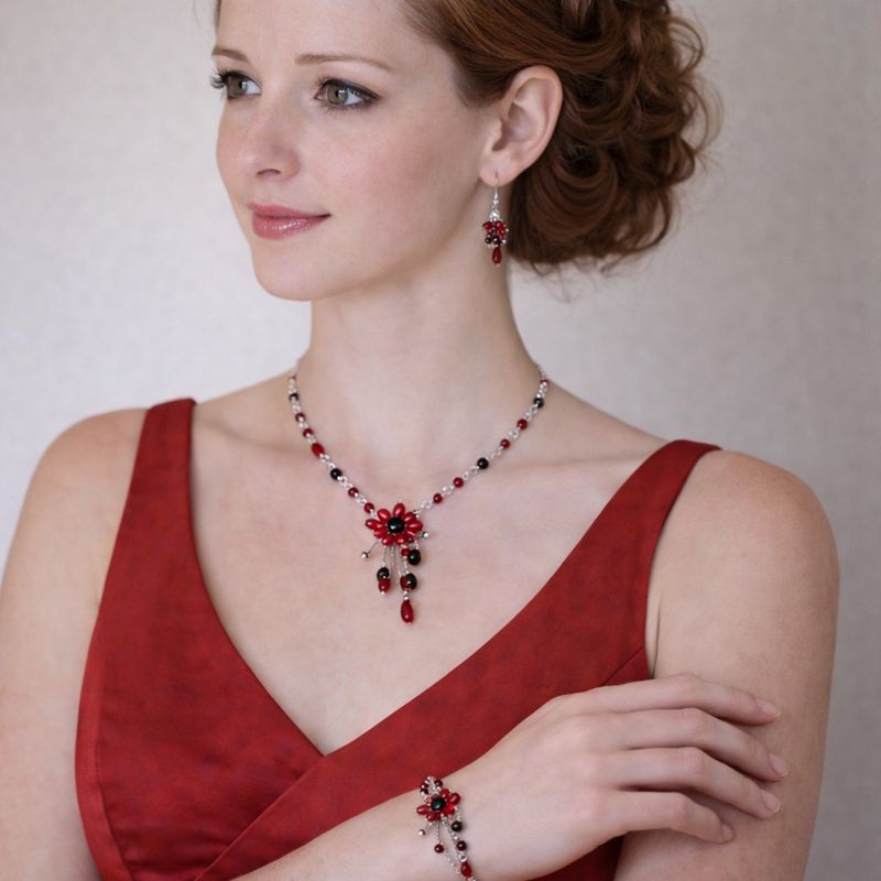 Jemný ručně vyráběný šperkový set v odstínech červené, vínové a stříbrné zaujme na první pohled květinovým motivem a lehkým, vzdušným provedením. Náhrdelník je decentně tvarovaný do středu výstřihu, doplněný ladícím náramkem a elegantními visacími náušnicemi, které krásně podtrhnou ženský vzhled.