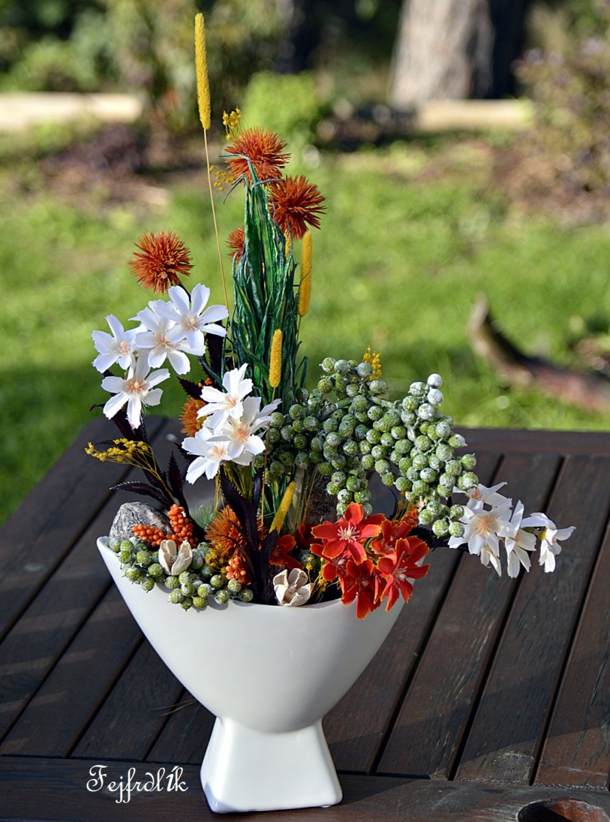 Luxusní dekorace ve značkovém českém porcelánu s umělými květinami a sušinou.
