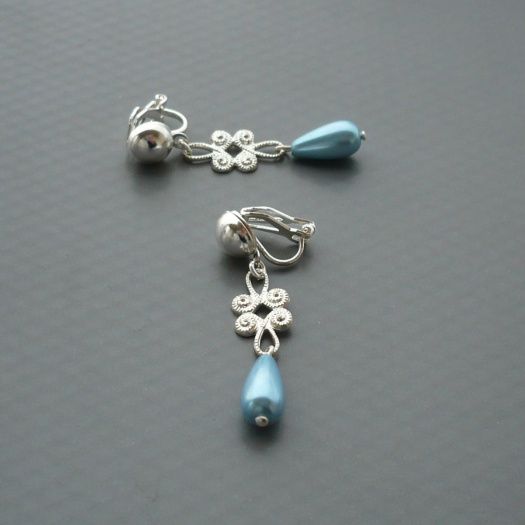 Lehké a krátké klipsové náušnice, na které není potřeba mít propíchnutá ouška, jsou tvořeny horním ozdobným bižuterním komponentem stříbrné barvy a spodní českou blankytně modrou voskovanou perličkou v podobě kapky.