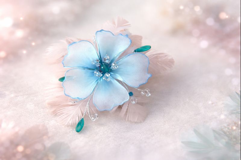 Tato elegantní květinová spona do vlasů v jemných odstínech tyrkysové a bílé je nádherným doplňkem pro slavnostní příležitosti. Květ z lehkého textilu je doplněn průzračnými korálky a jemnými pírky, které dodávají celému designu vzdušnost a romantický charakter. Spona perfektně drží v účesu a snadno se kombinuje se svatebními či společenskými šaty.