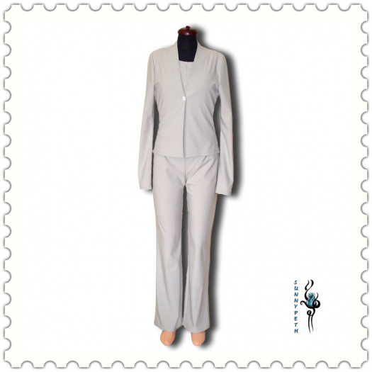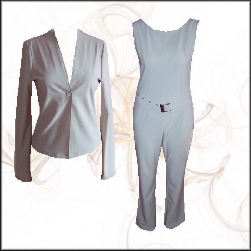 Kabátek je nepodšitý a zapíná se na jeden knoflík (stejné barvy jako overal) a má dlouhé rozšířené rukávy. Má nízký stojáček a na zadním díle jsou pasové záševky ozdobě prošité.