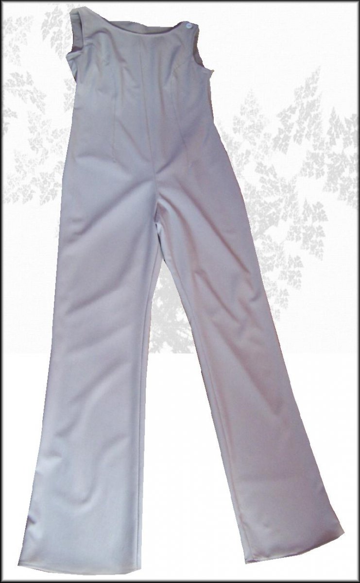 Overal se zapína na levém boku zipem a levém ramínku na knoflík.Má princesové záševky ozdobně prošité.Nohavice jsou mírně rozšířené.