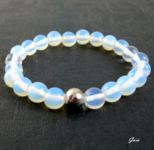Náramek z opalitu a korálků z chirurgické oceli. Navlečeno na pružném vlasci.