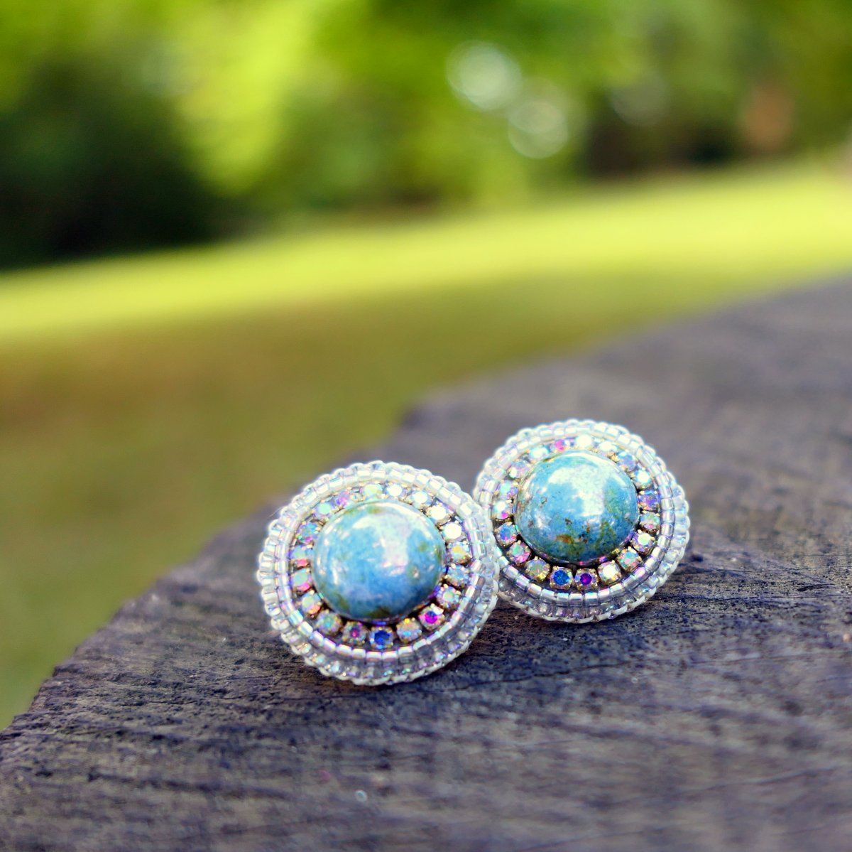 Vyšívané náušničky průměru 2,2 cm, puzety z chirurgické oceli v barvě platina. Včetně silikonových zarážek.