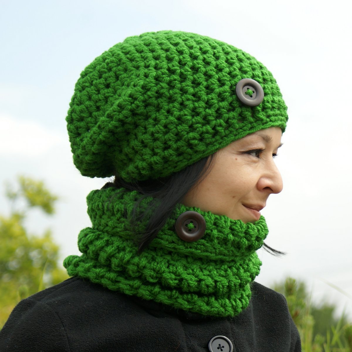 Zimný háčkovaný set vo výrazne zelenej farbe