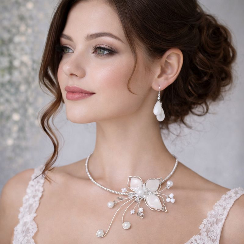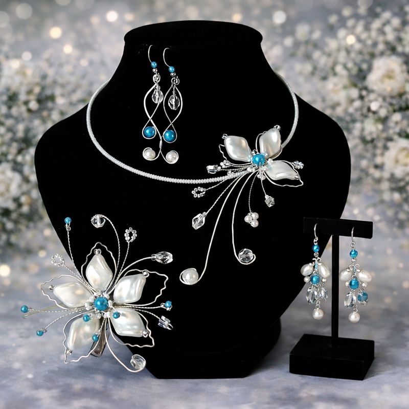 Dopřejte si výjimečnost v každém detailu. Tento ručně vyráběný autorský šperkový set je navržen pro ženy, které hledají originalitu, eleganci a nadčasový luxus. Jemná květinová kompozice z perleťových lístků, křišťálových korálků a tyrkysových akcentů vytváří harmonii, která dokonale vynikne na slavnostních i svatebních šatech.