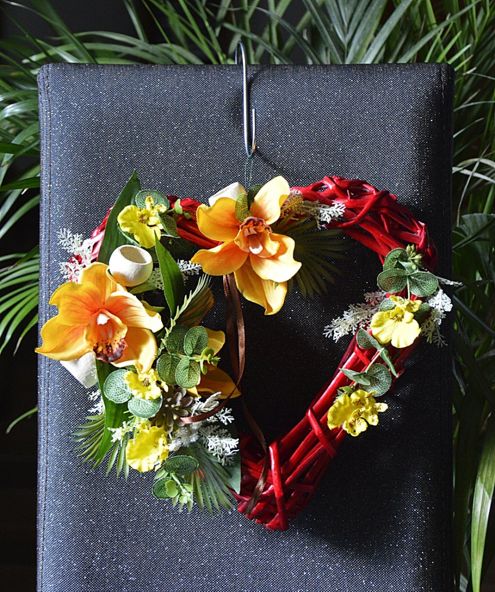 Proutěné červené srdce s krásnou umělou orchidejí , palmovými listy, umělým eukalyptem a sušinou .
