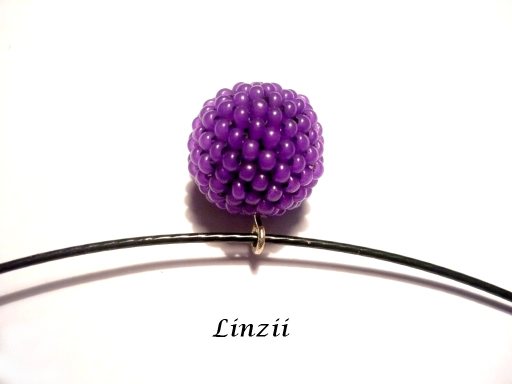 Ručně obšívaná kulička z rokajlových korálků fialové barvy. Kulička je na nýtku a zavěšena na obruči. Uzávěr černé obruče je šroubovací.