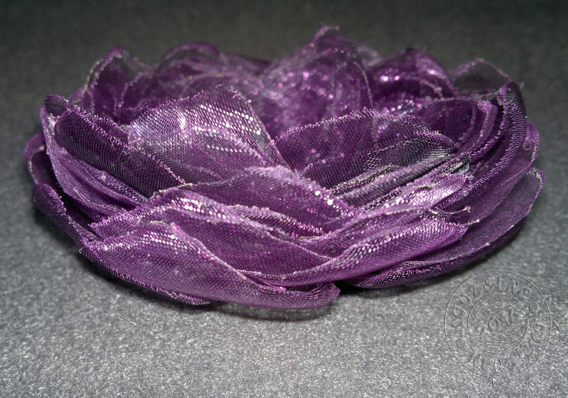 Brož - spona ve tvaru květu, vyrobená z "květinových plátků," bohatý květ poskládaný z organzy krásné fialové barvy, s odlesky černé, zdobený korálky a perličkami, rozměry: průměr cca 10 cm, výška cca 4 cm.