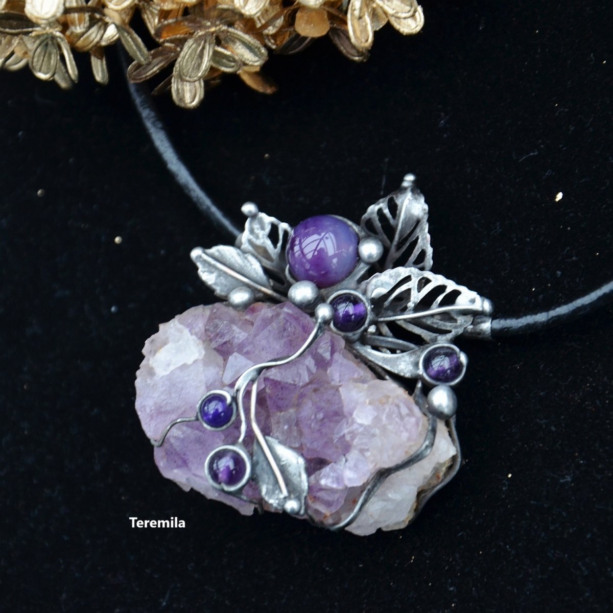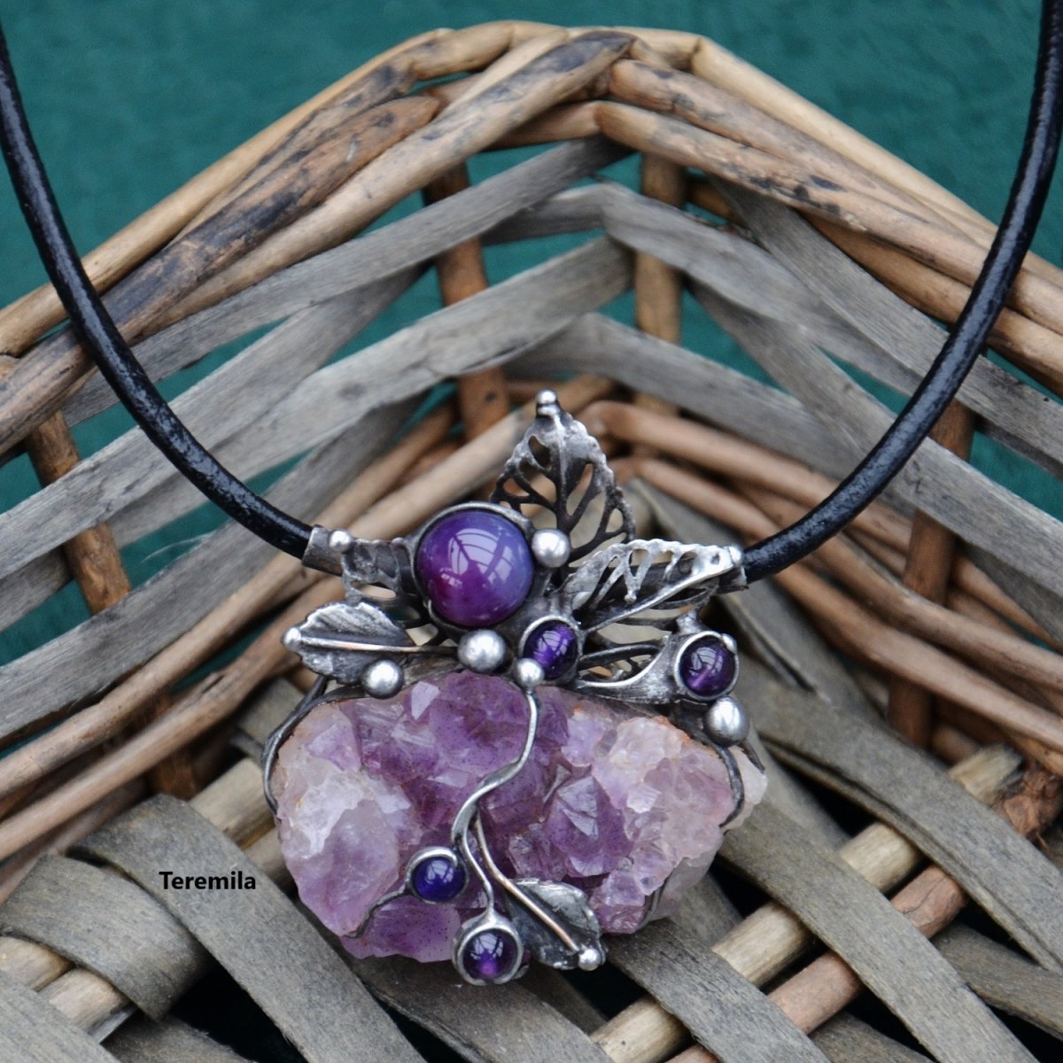 Šperk je vyroben cínováním. Je tvořen překrásnou drúzou sytě fialového ametystu. Krystaly jsou veliké a vystupují do výšky. Kámen je velký 4,5 x 3 x 1,8 cm, a proto je šperk plastický. Všechny další doplňky šperku jsou rovněž ametysty. Spodná strana kamene je kryta, aby nedošlo k poškození oděvu.