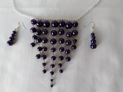 Perlová souprava je tvořena náhrdelníkem z fialových perliček a párem náušnic. Perličky jsou voskované skleněné ve velikosti od 13 mm do 4 mm. Náhrdelník je dlouhý 43 cm a je zakončený prodlužovacím řetízkem pro libovolné nastavení délky.