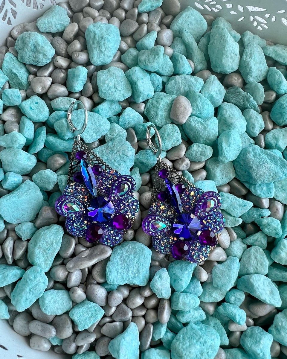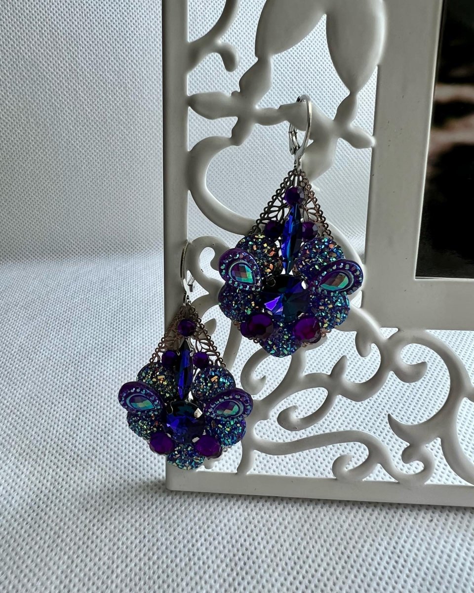 Nádherné ručně vyráběné náušnice s fialovými kamínky.Velikost: 3 x 4 cm (+ zapínání)Tento druh náušniček dodávám v krabičce.