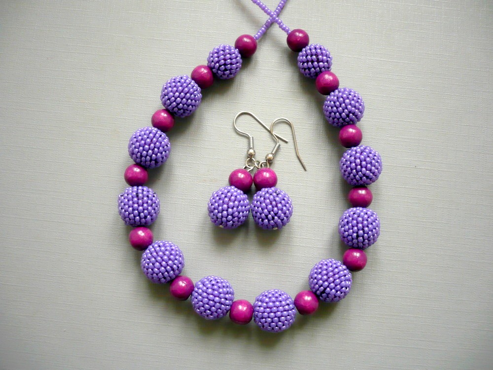 Ručně šitý šperk - jednotlivé kuličky obšívané rokajlovými korálky. Šito kvalitní korálkovací nití Nymo. Délka náhrdelníku 46 cm. Do sady jsou ušity i náušnice. Barva fialová, celkově jsou korálky velmi zajímavé. Doplněno komponenty v barvě platina a dřvněými korálky. V nabídce také v jiných barvách.
