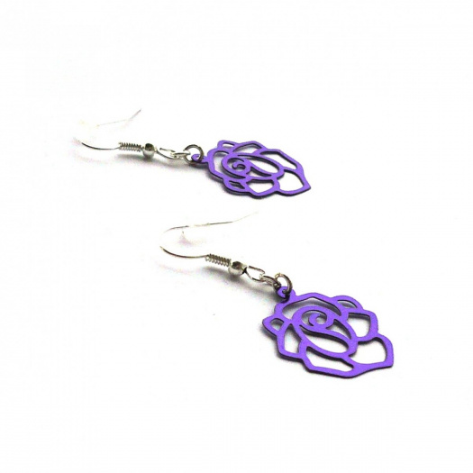 Náušnice jsou z fialového dekorativně vyřezávaného plíšku ve tvaru růžičky. Náušnice jsou lehoučké, příjemné a módní.