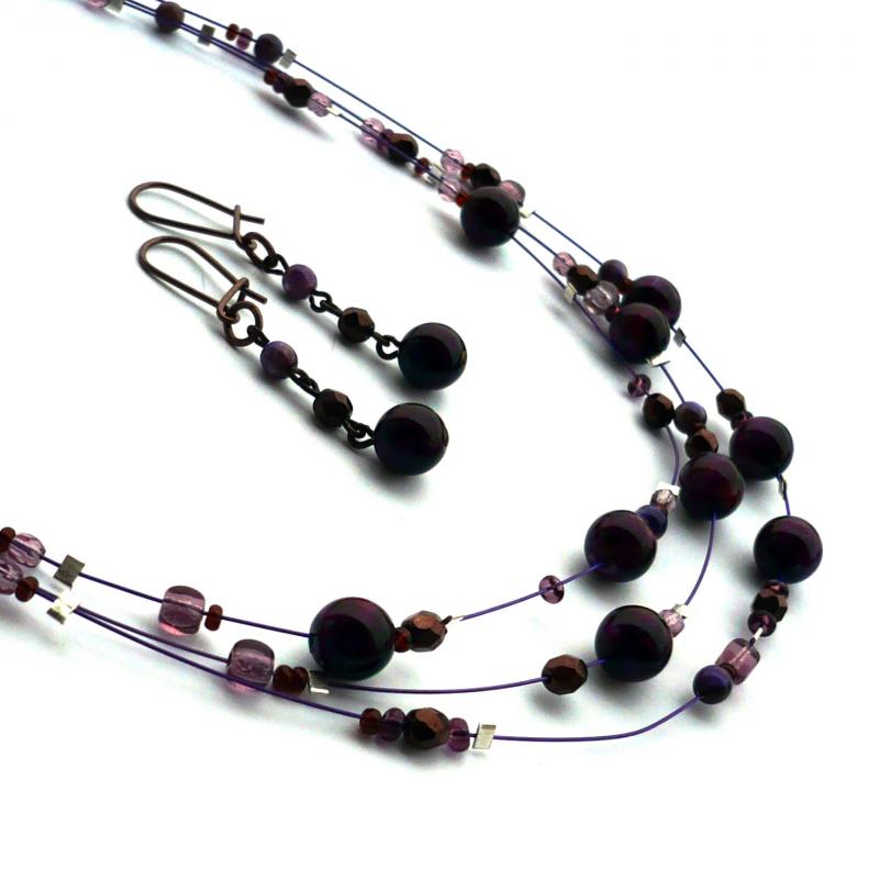 Souprava se skládá z třířadého lankového náhrdelníku a krátkých náušnic. Náhrdelník je tvořený z tří řad bižuterního lanka fialové barvy, na kterém jsou v nepravidelných odstupech od sebe navlečeny různě velké a tvarované skleněné korálky fialových a hnědých odstínů. Obvod náhrdelníku je 43 cm. Zapínání je na karabinu a protikroužek stříbrné barvy. Náušnice jsou z spodního tmavěfialového mourovaného většího korálku, prostředního hnědého broušeného a horního mourovaného fialovohnědého korálku. Délka náušnice včetně zapínání je 4 cm. Zapínání je na uzaviratelný afroháček měděné barvy.