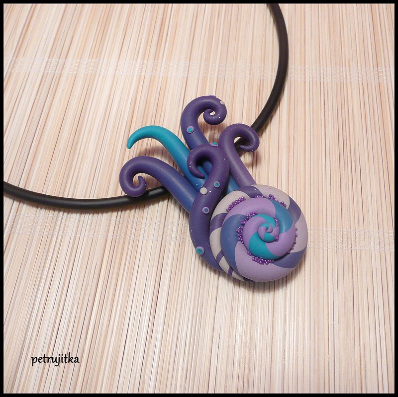 Dámský náhrdelník s přívěskem z polymerové hmoty. Barva je fialová,