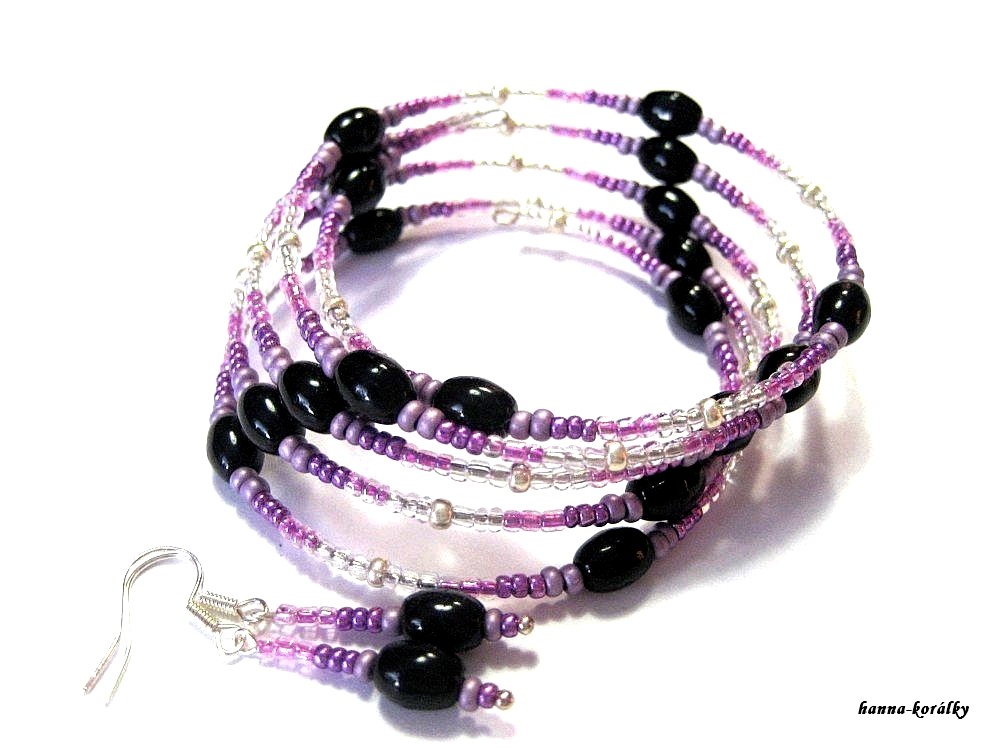 Náušnice a náramek z rokajlu a skleněných korálků v barvě černé, fialové a bílé čiré - na paměťovém drátu, který se na ruku nasazuje velmi jednoduchým namotáváním