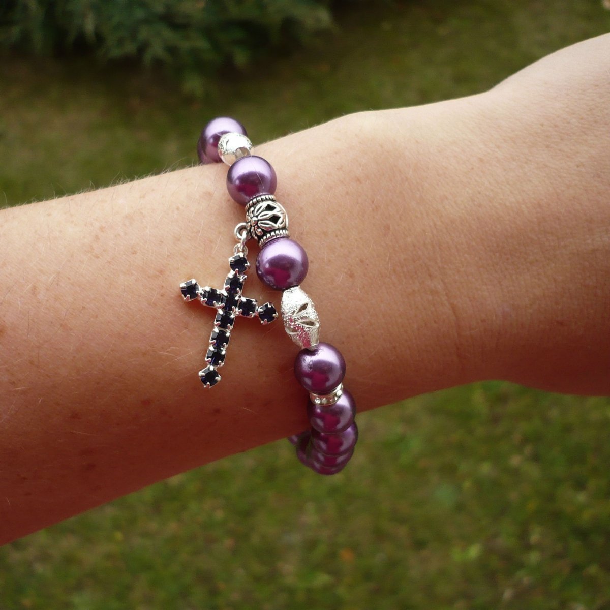 Fialové voskované perličkou jsou doplněné o ozdobné bižuterní komponenty - rondelky s čirými kamínky, kovovými korálky stříbrné barvy a štrasový křížek.