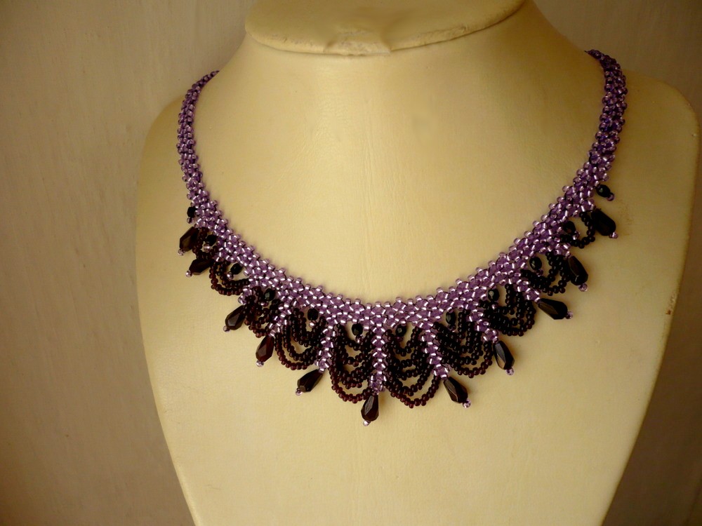 Ručně šitý náhrdelník z rokajlových korálků fialové barvy, doplňeno černými ohňovkami a fialovými broušenými kapkami. Délka náhrdelníku je 42 cm. Zapínání je na karabinku z chirurgické oceli, je tedy hypoalergenní.