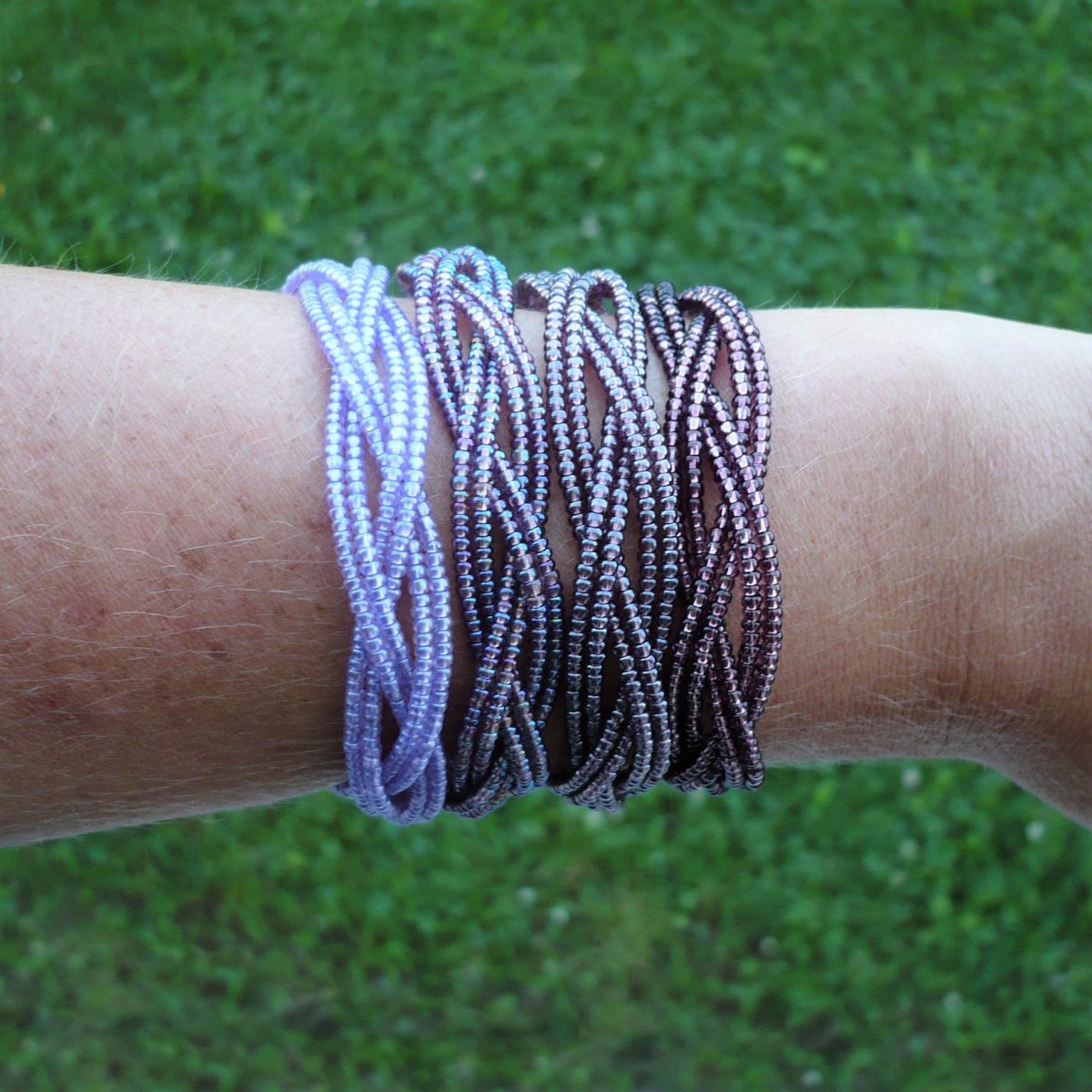 Náramek je tvořený z několika propletených řad drobných fialových lesklých skleněných korálků jemnými barevnými odlesky.