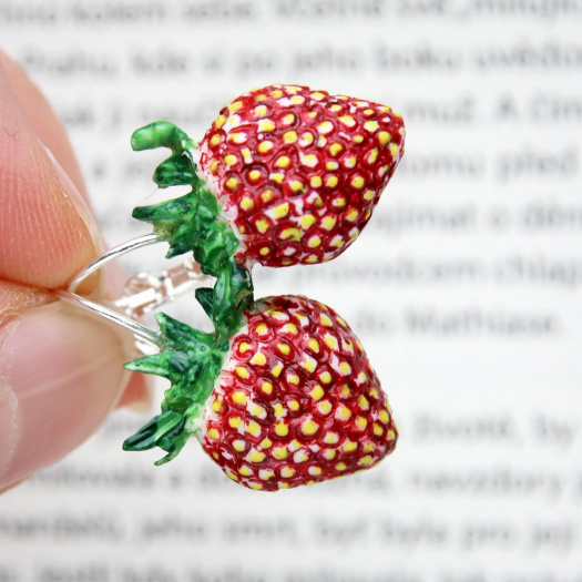 náušnice s polovinami jahod z polymerové hmoty (1,7x2cm)na zavíracích háčcích.