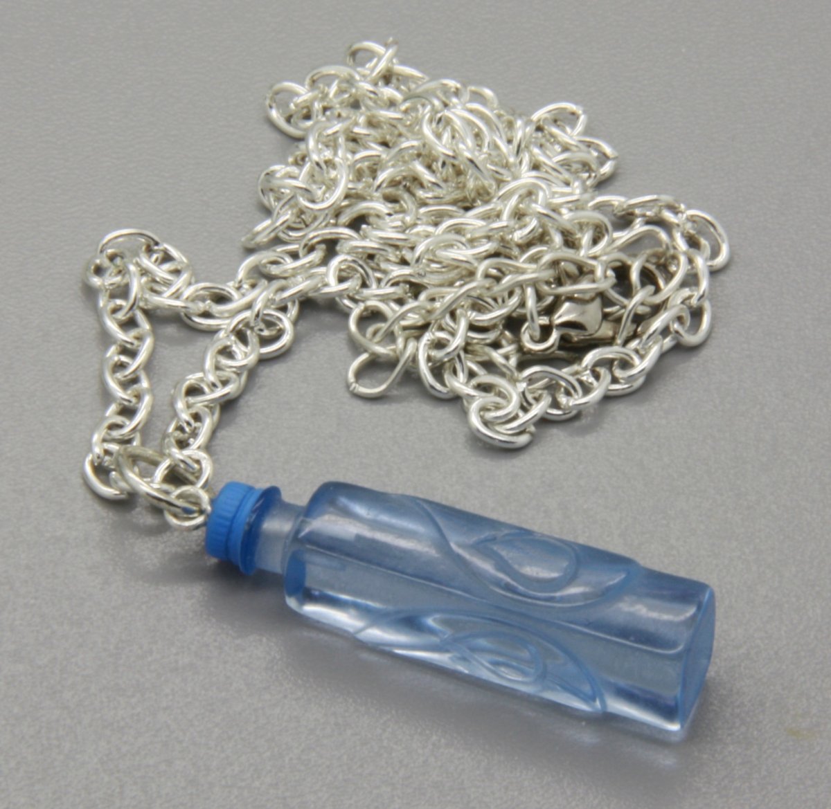 ručně modelovaný salát, doplněno o kovový komponent v podobě činky, lahev z pryskyřice výšky 3,5 cm,