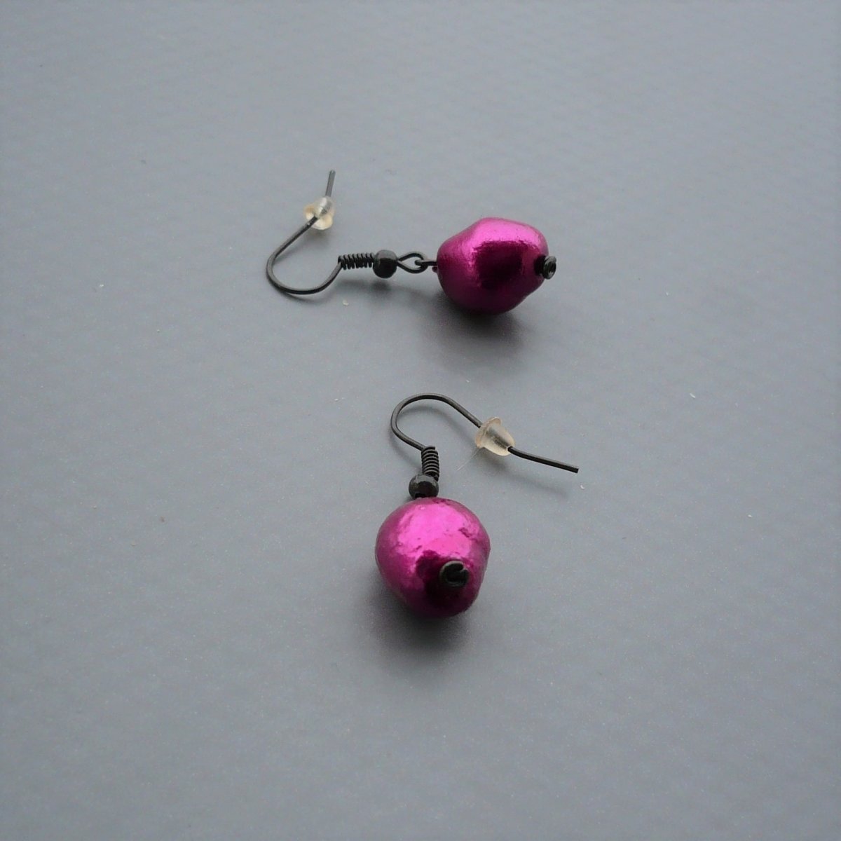 Krátké náušnice z české voskované perličky fuchsiově růžové barvy se zvrásněným povrchem..