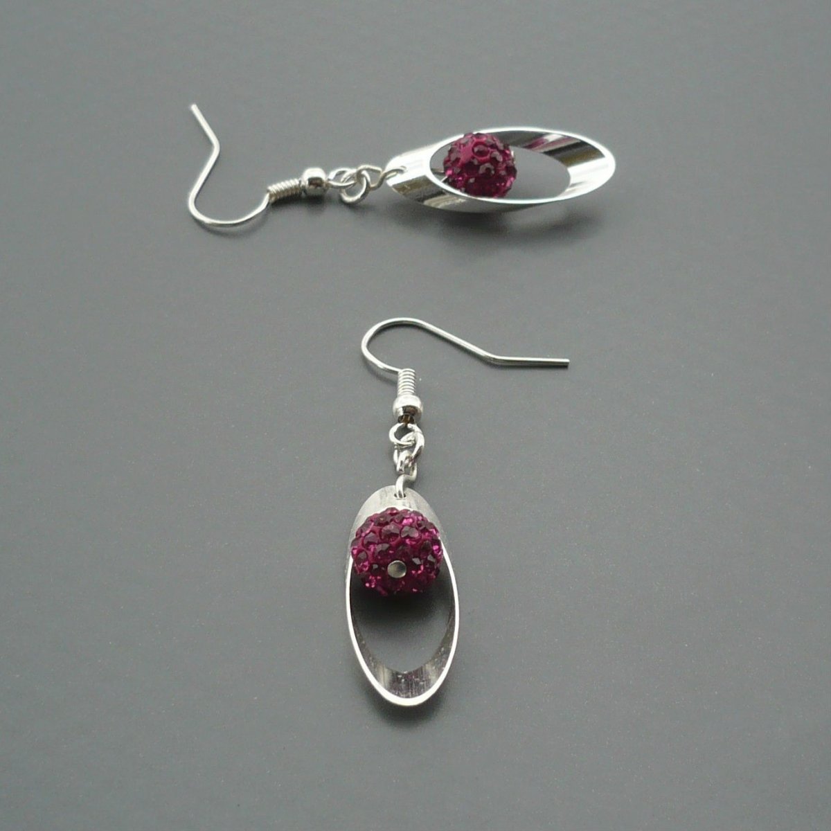 Fuchsiový korálek s mnoha třpytivými kamínky je umístěn v horní části oválného 3D komponentu stříbrné barvy.