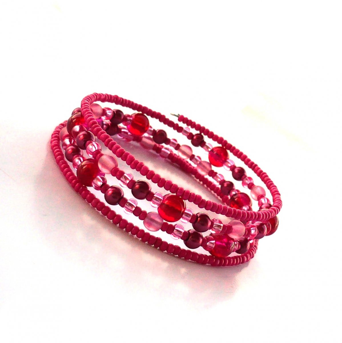 Fuchsiově růžové korálky různých velikostí (max. průměr korálku je 6 mm) jsou podle vlastního vzoru navlečeny na čtyřech řadách paměťového drátku (i přes velké roztažení se vrátí do svého původního tvaru).