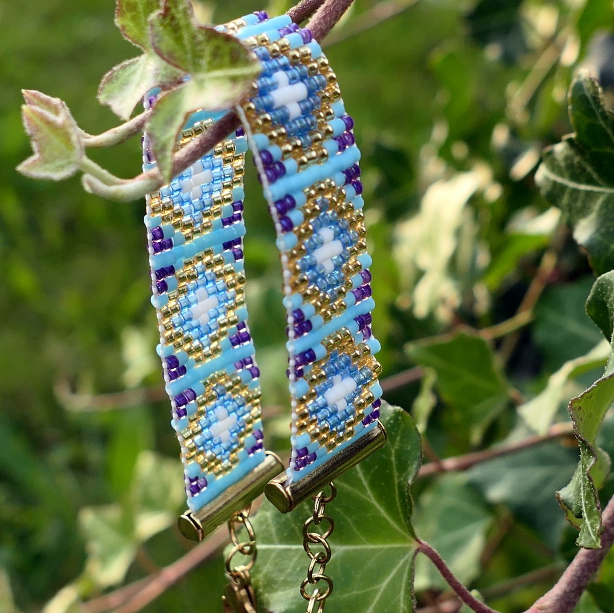 Ručně tkaný náramek z luxusního japonského Miyuki rokailu - světle modrá, modrá, fialová, bílá a zlatá, geometrický vzor.