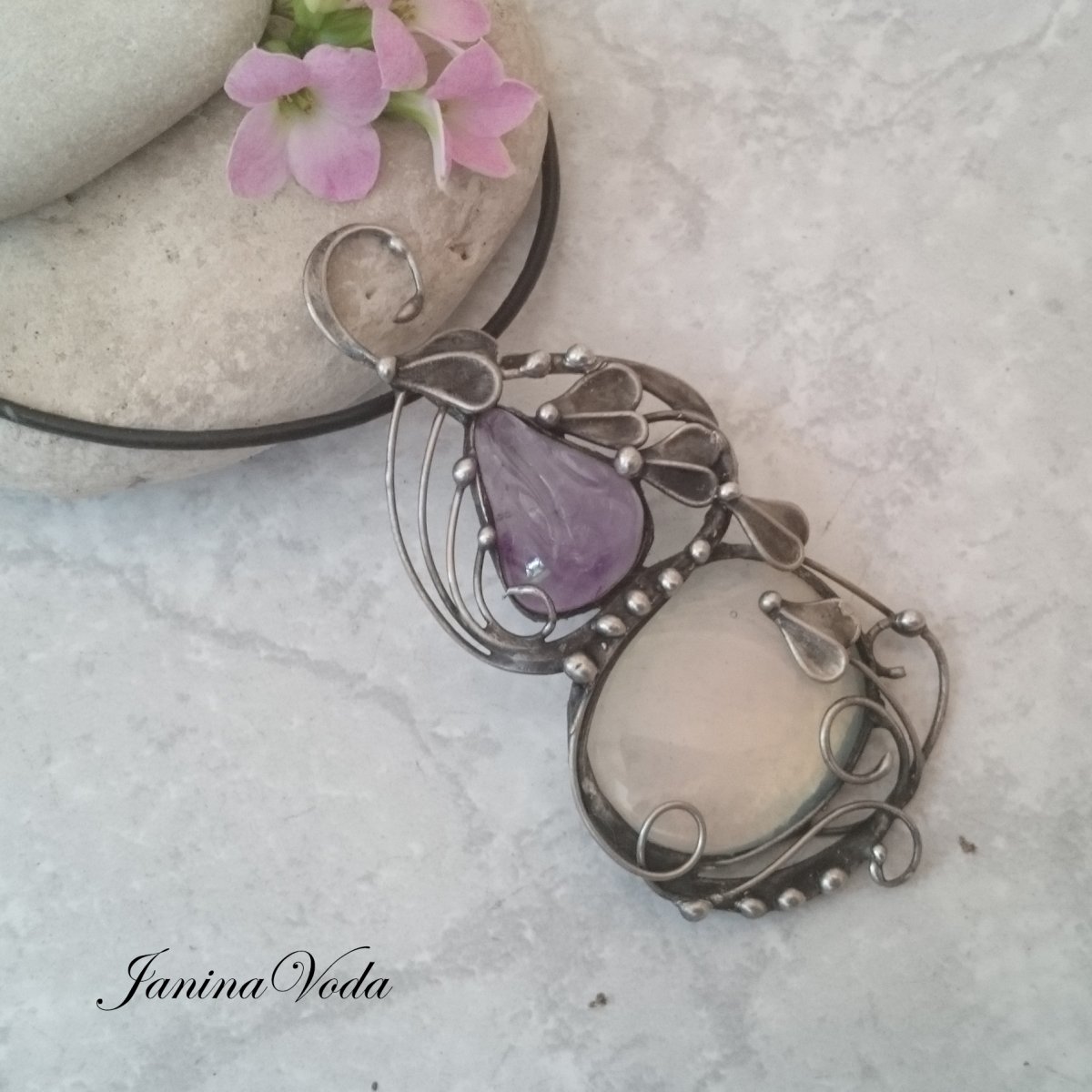 Cínovaný, patinovaný náhrdelník následně leštěný a ošetřený antioxidantem ze syntetického opalitu a přírodního ametystu se spoustou lístečků a krucánků.