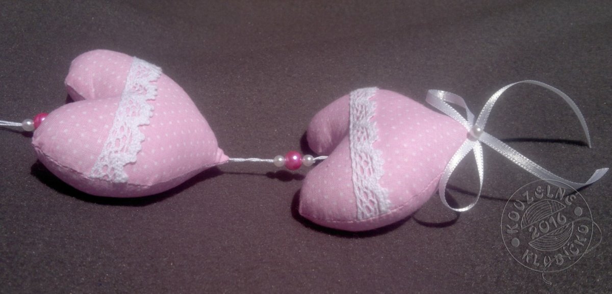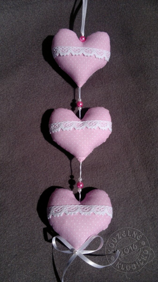 Girlanda ze 3 šitých srdíček, zdobená stužkami a korálky. Srdíčka jsou ušitá ze 100% bavlny růžové barvy s droboučkými bílými puntíčky, plněná dutým vláknem, zdobená bavlněnou krajkou.