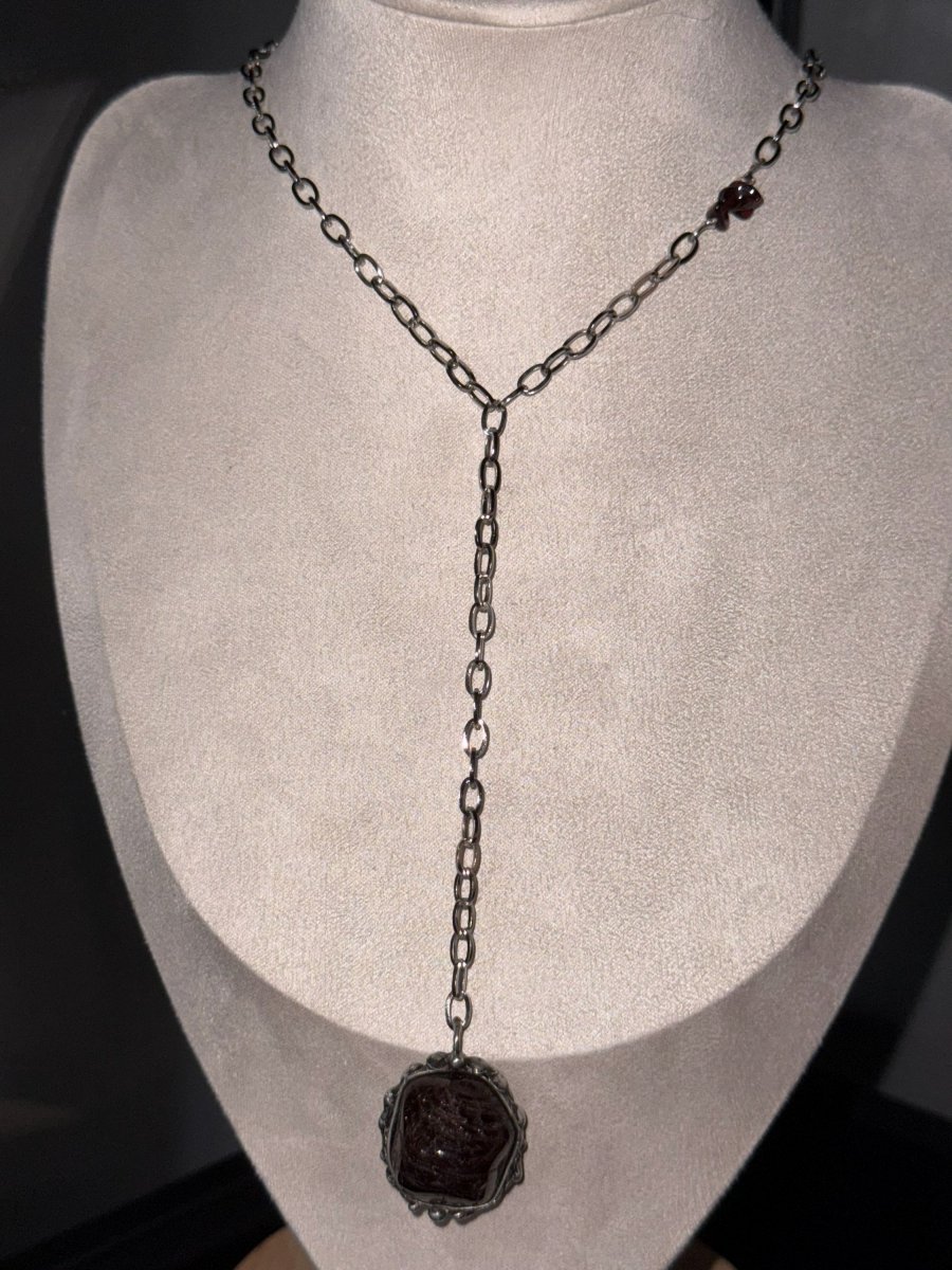 Náhrdelník z afrického GRANÁTU na řetízku z chirurgické oceli. Drobné kamínky granátu jsou vložené přímo do řetízku v horní části u krku.