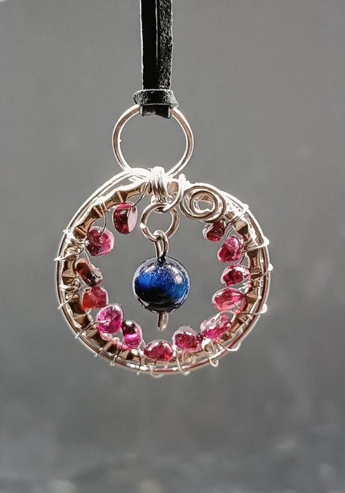 Medailonek z nerezové oceli je zdobený korálkem modrého tygřího oka a granátky.
