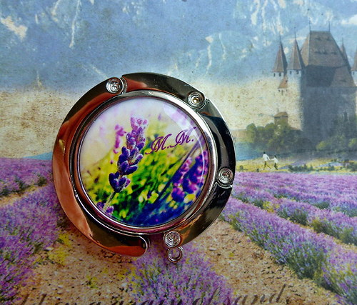 háček na kabelku s vlastní fotkou levandule, přikrytou epoxy čočkou, iniciály na vaše přání, případně doplním jméno, věnování...