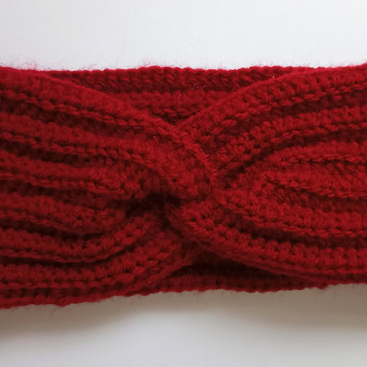 Háčkovaná vínová čelenka. Obvod 42 cm, šíře 9 cm.