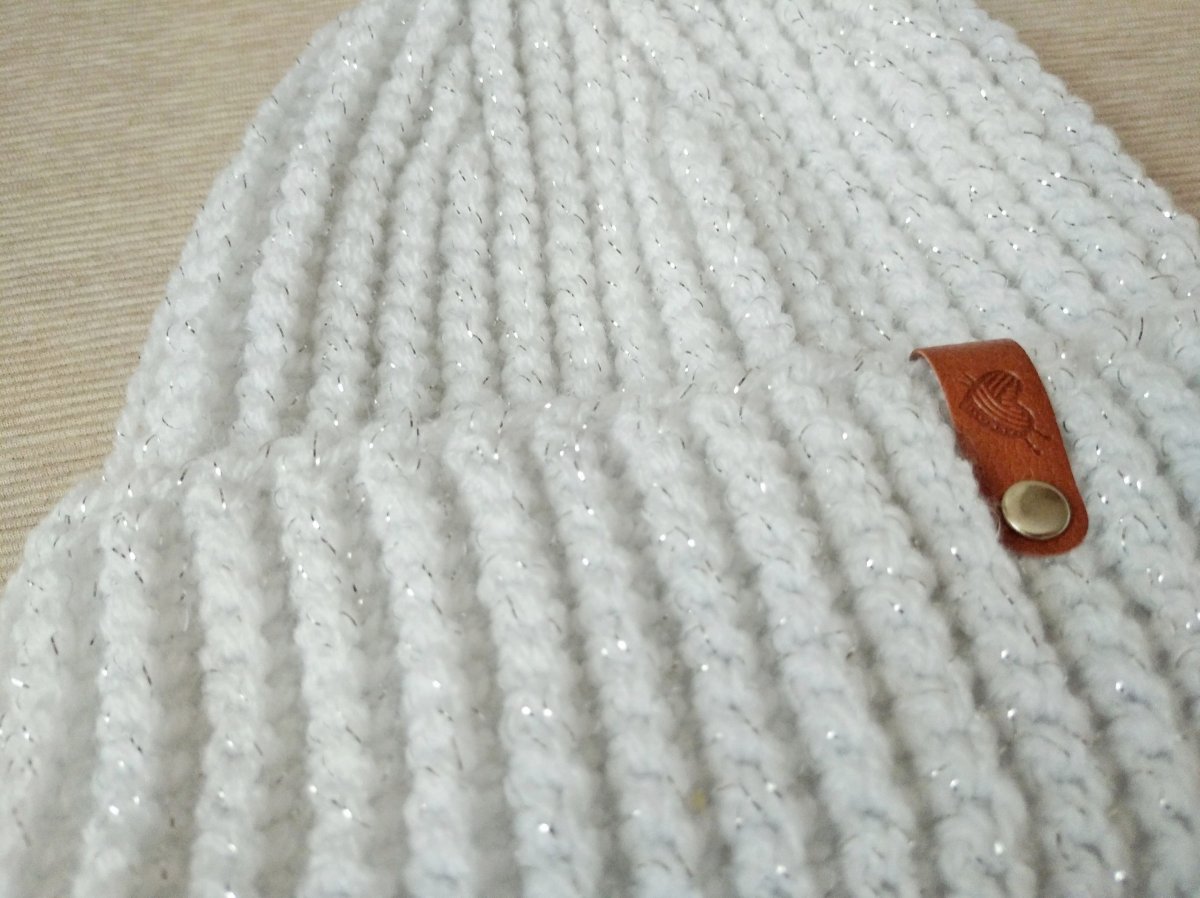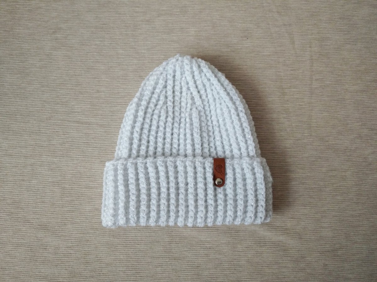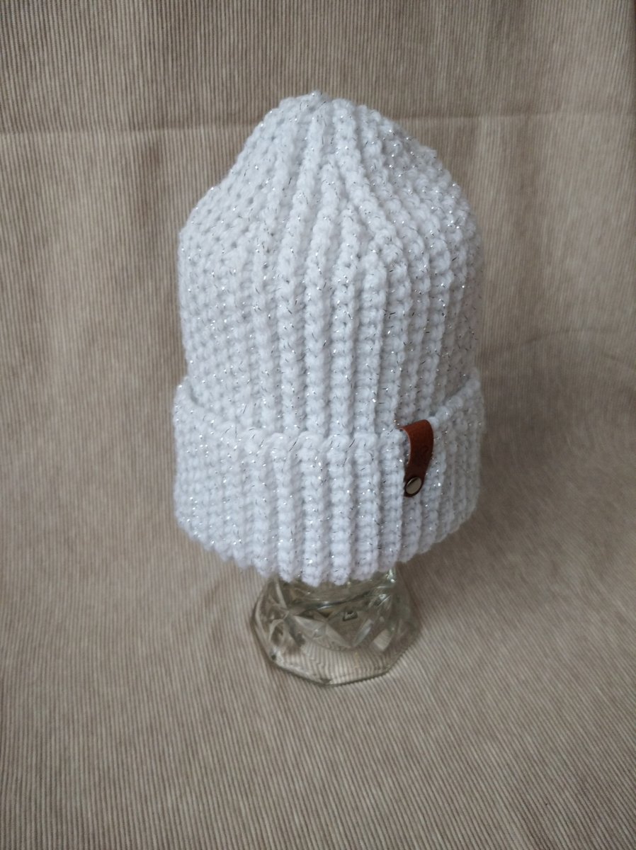 Módní a šik čepice je velice nadýchaná a jemná, háčkovaná z bílé akrylové příze s lurexovým vláknem (stříbrným lesklým), které dodává čepici šmrc.