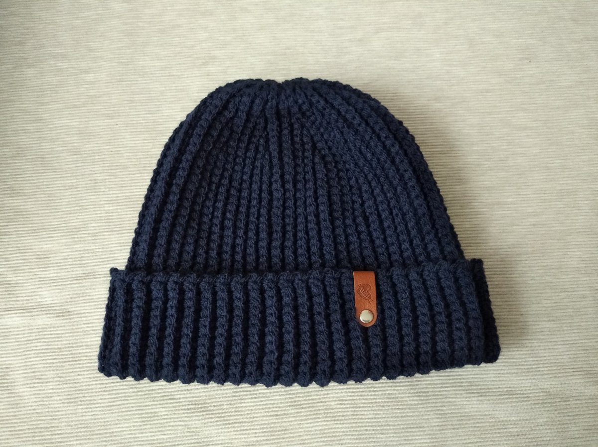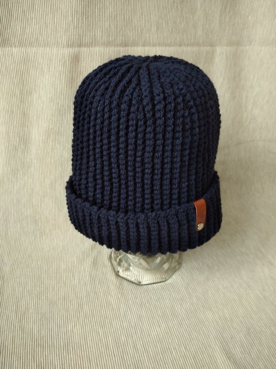 Módní čepice s lemem na ohrnutí, velice nadýchaná a jemná, háčkovaná z tmavě modré akrylové příze.