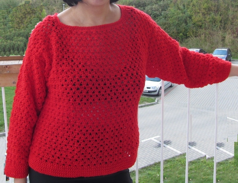 S různými doplňky pro různé příležitosti od rána až do noci užijete tento kratší, střihově jednoduchý háčkovaný svetřík ve výrazné rumělkově červené barvě.