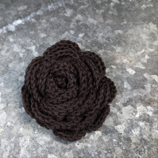 Květina o průměru cca 5,5 cm uháčkovaná z tmavě hnědé (téměř černé) příze. Je opatřena brožovým můstkem.