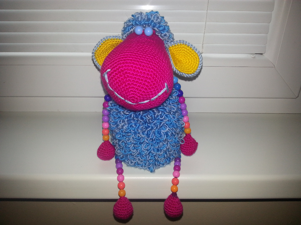 Ovečka je háčkovaná ze 100% akrylu. Měří 30 cm i s nožičkami, vyplněná dutým vláknem a ozdobena plastovými korálky.