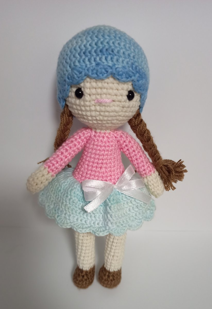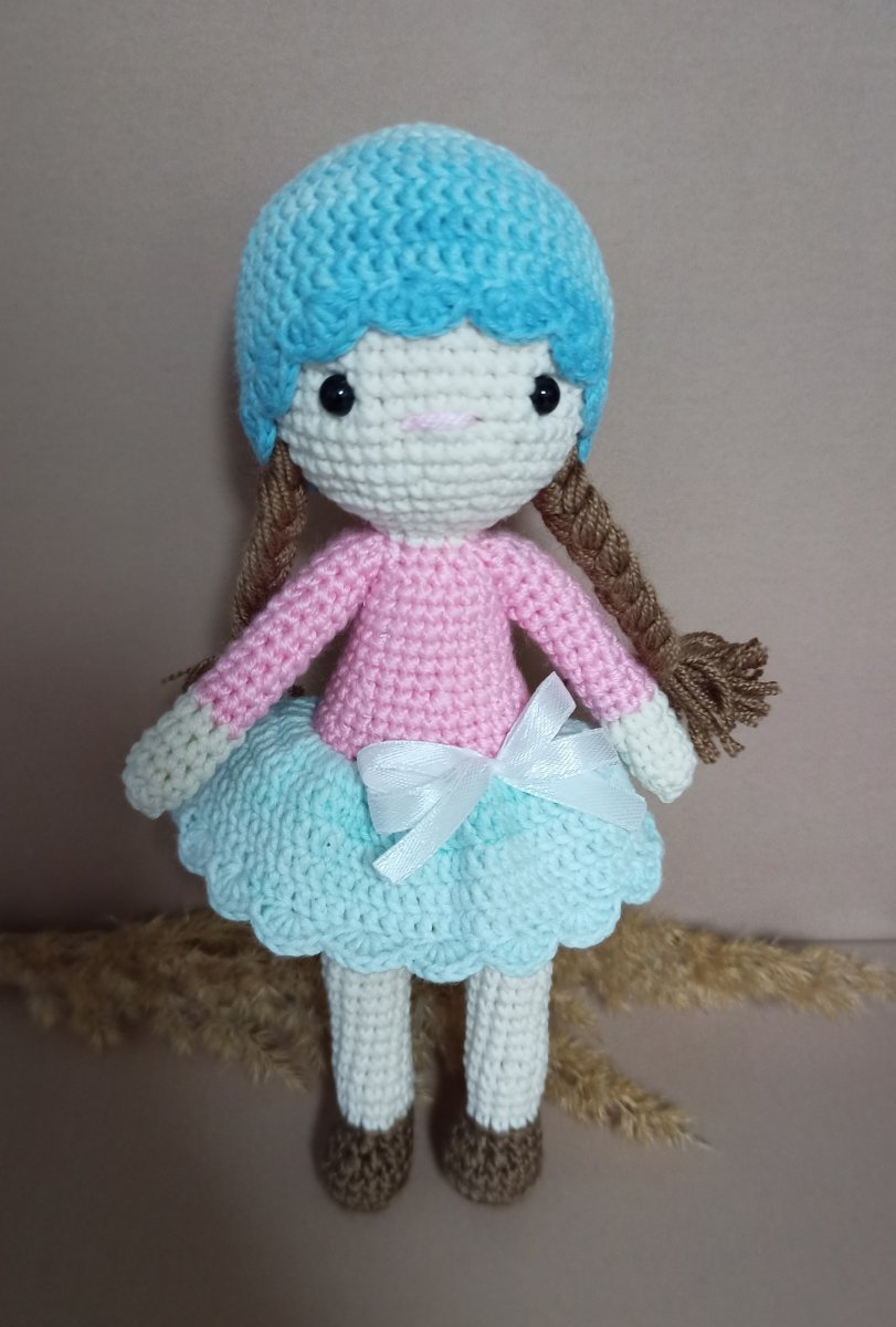 Ručně háčkovaná panenka s celkovou výškou 20 cm.