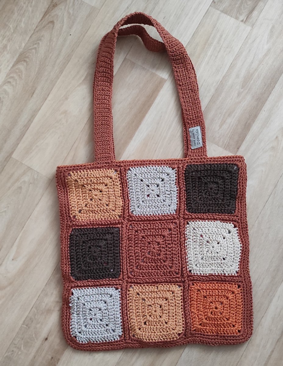 Taška háčkovaná z bavlněné příze, s podšívkou a zapínáním na magnetický knoflík. Rozměr cca 33 cm x 37 cm + ucha. Barevnou kombinaci lze změnit.