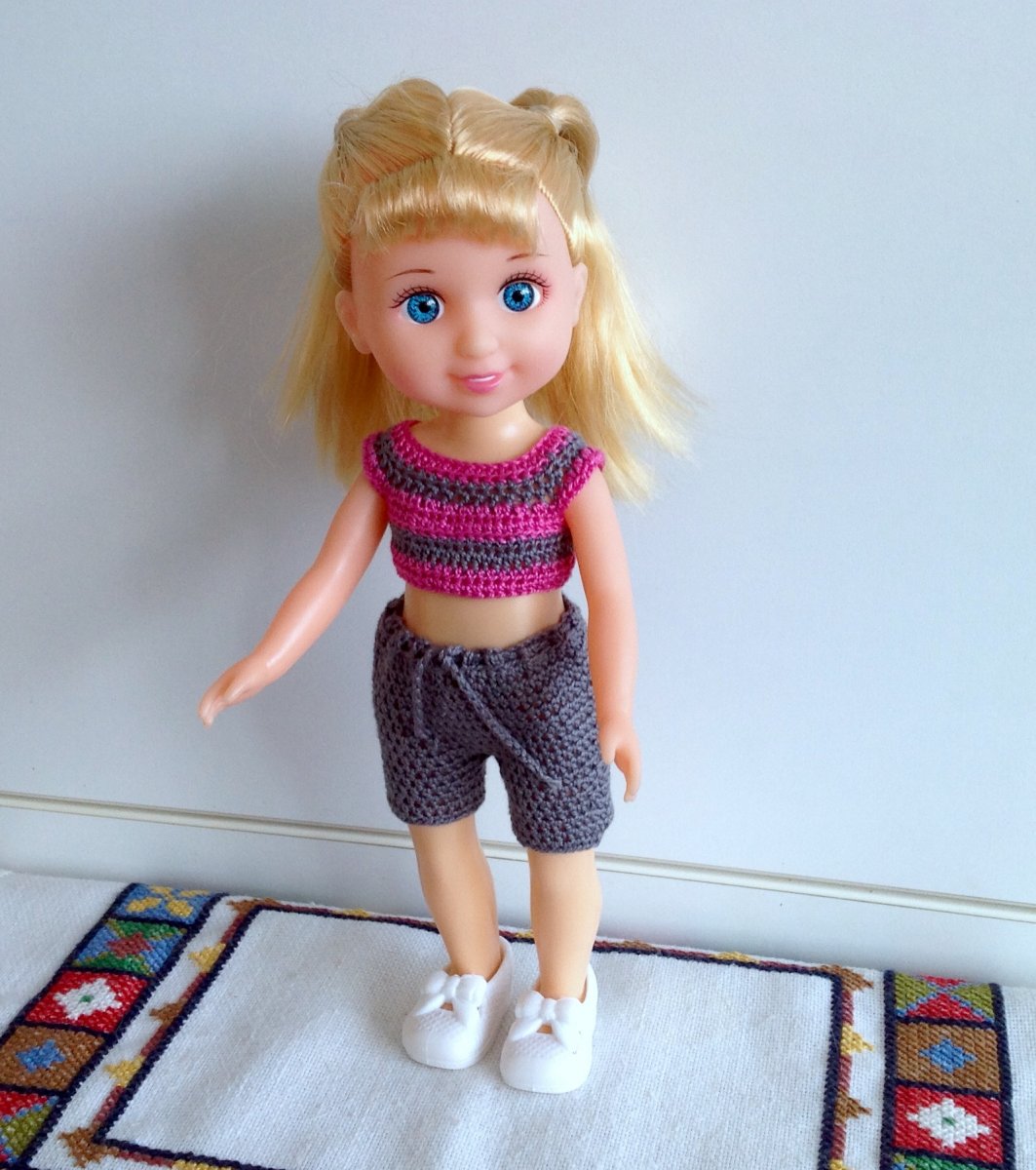 Souprava je uháčkována z tenké 100% bavlněné příze perlovky. Vzadu od výstřihu je zapínání na suchý zip, proto se snadno obléká. Kraťasky se zavazují háčkovanou šňůrkou. Tato souprava se hodí pro panenku s rozměry: šířka hrudníku 12 cm - 16 cm. Možno vybrat z více variant.