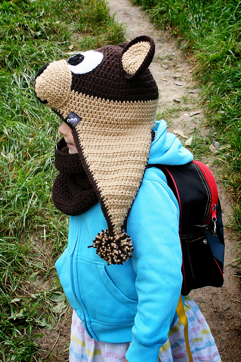 Háčkovaná zimní ušanka Méďa v kombinaci světle a tmavě hnědé.